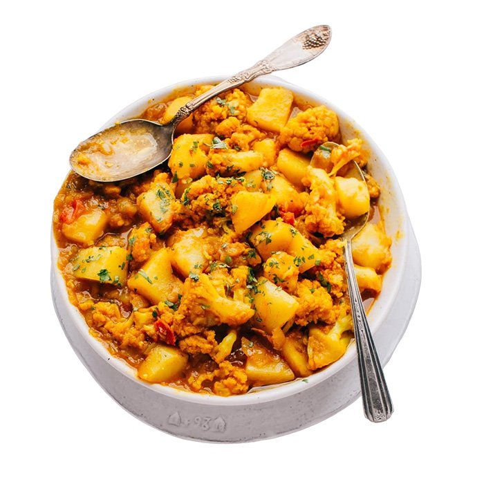 A beautifully styled serving spoon full of paneer biryani set against a traditional Indian pot, with herbs and spices artfully scattered around