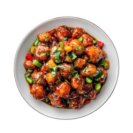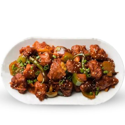 "Juicy chicken pieces stir-fried in a spicy, tangy Indo-Chinese sauce with onions and peppers—semi-gravy style, ideal with fried rice or noodles."